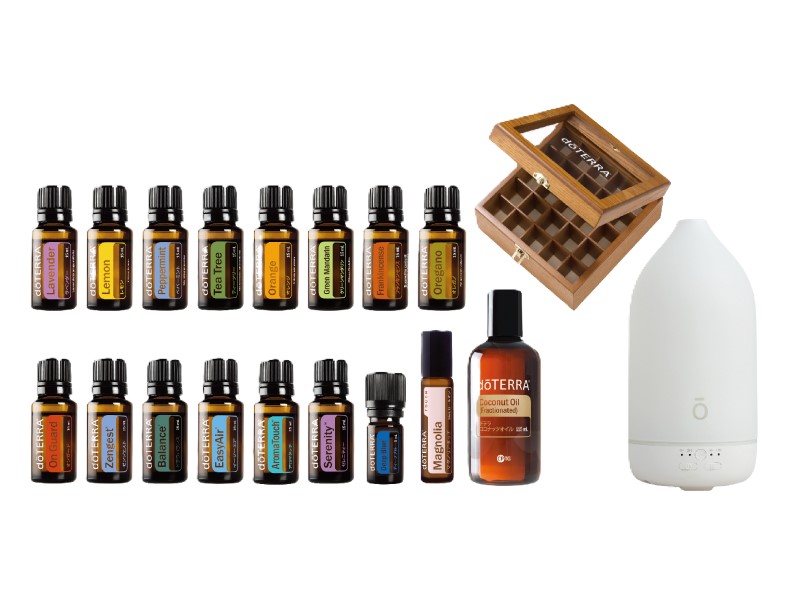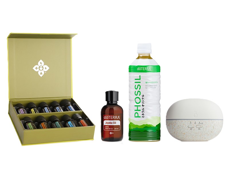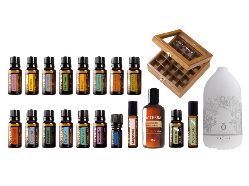 ドテラを始めるならぜひ揃えたい、人気オイル10種を詰め合わせた「ファミリー エッセンシャルズキット」に、必需品のキャリアオイルとディフューザー、