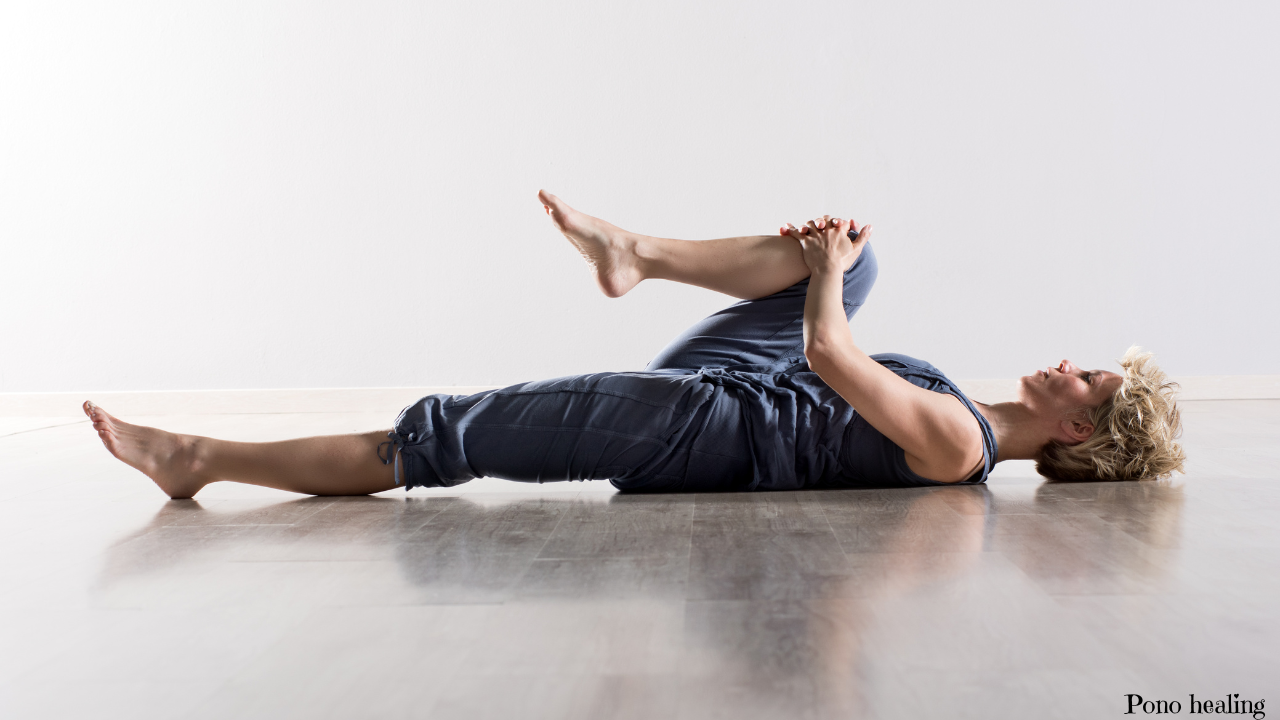 - 足を組んだまま、両手で下の脚のもも裏を抱えて胸に引き寄せる